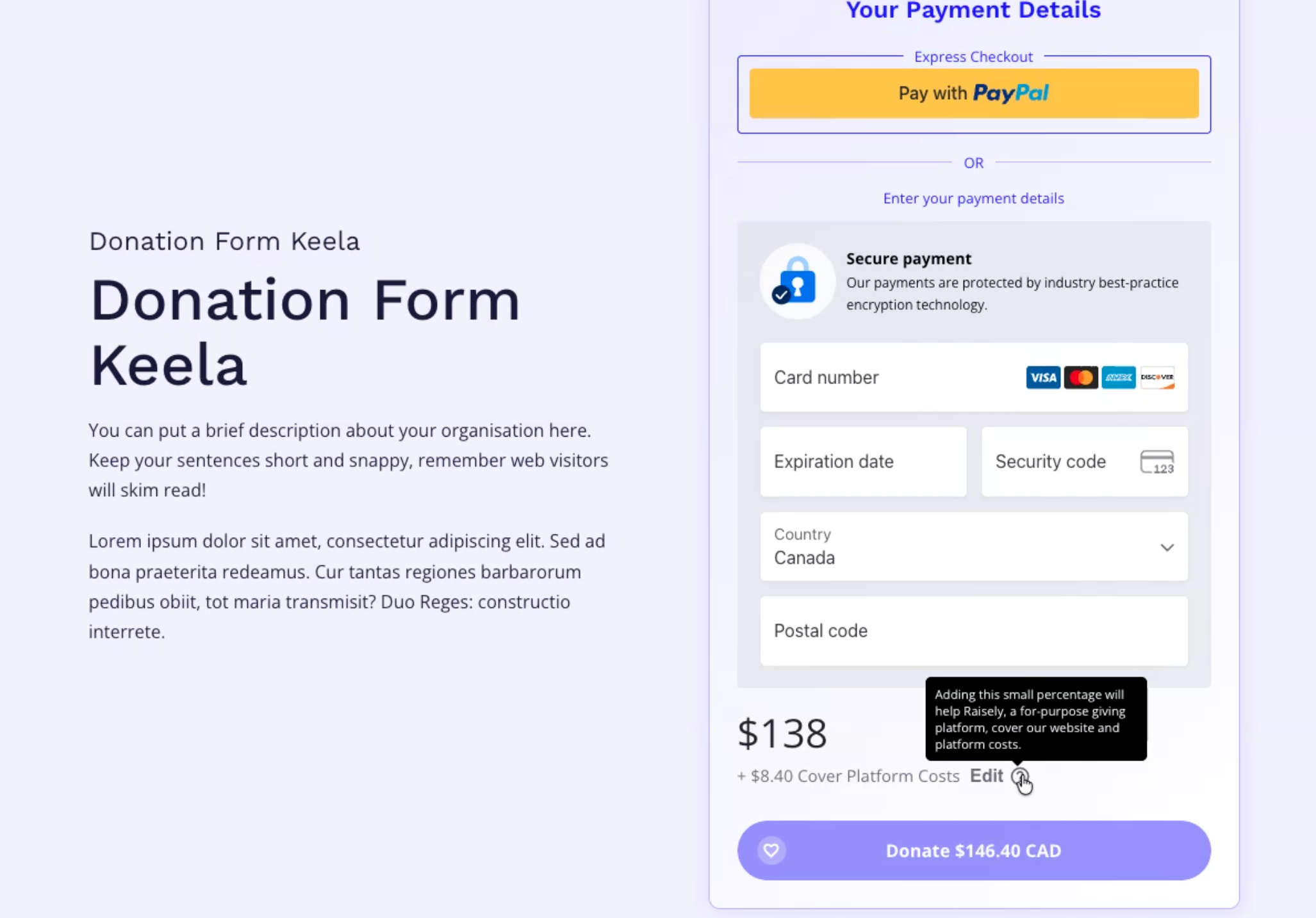 Raisely is offered for free to charities and non-profits. To cover our costs and continue investing in the platforms growth, at the time of transaction we ask donors for an optional fee on top of their donation to you.