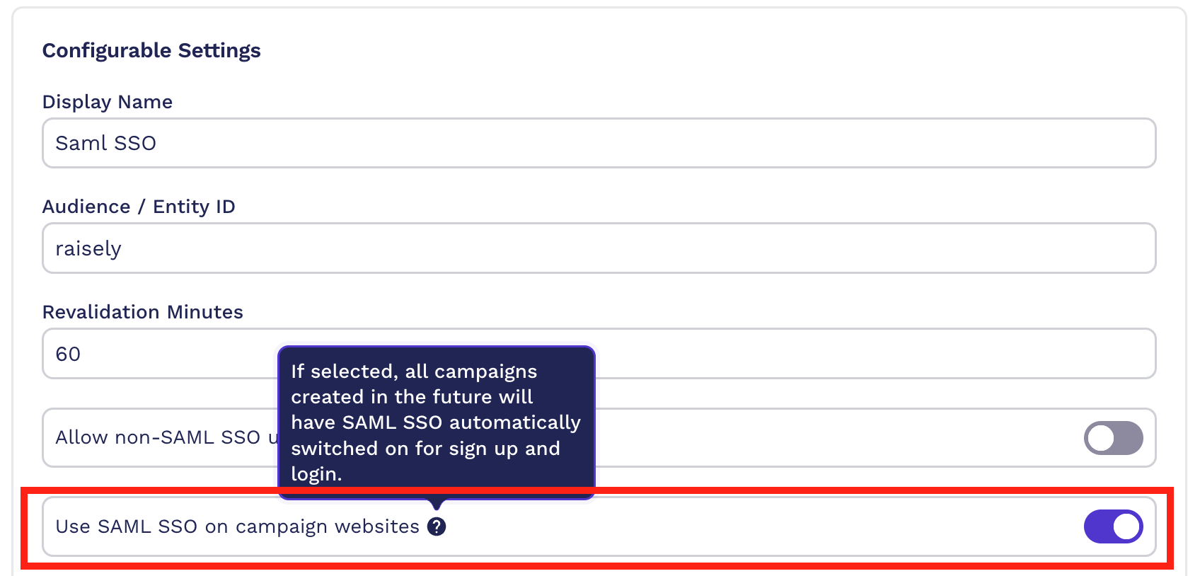 - Once you have configured your IdP to work with Raisely's SAML SSO setup, you still have control over turning the feature on or off.