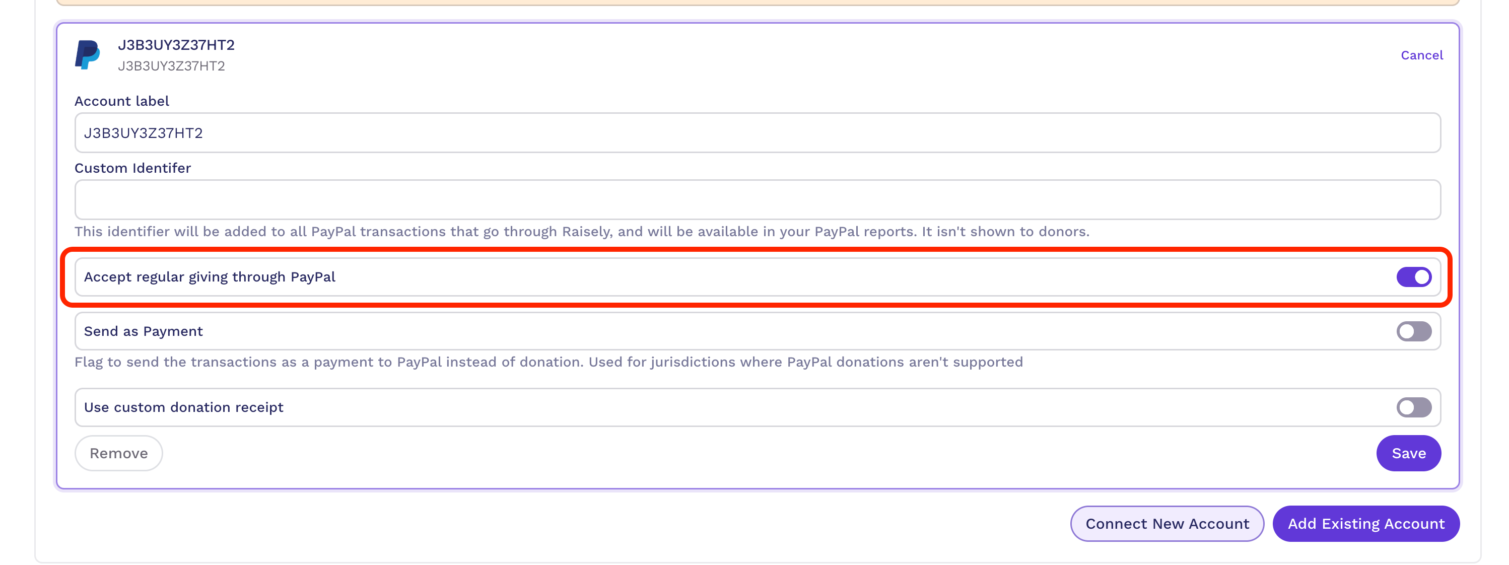 To turn on regular giving for PayPal, you will need to edit your PayPal payment gateway settings in Payments & Receipts and toggle-on “Accept regular giving through PayPal”.