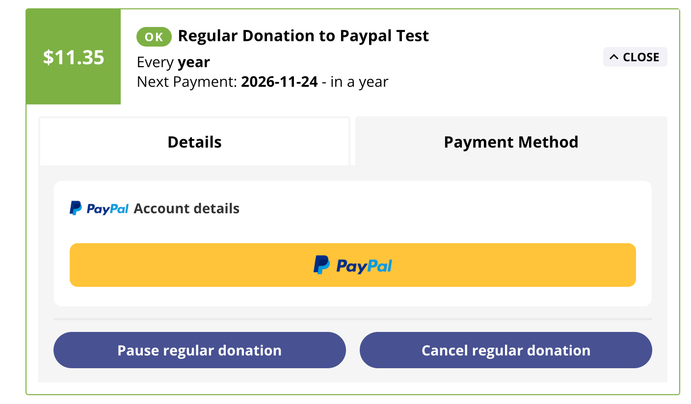 The donor can pause and cancel their regular donation when logged in. Do note that they cannot edit the amount, currency or frequency of their donation. To revise this, they will need to cancel their existing regular donation and create a new regular donation subscription. To edit their PayPal account information, they will be prompted to login to their PayPal account.