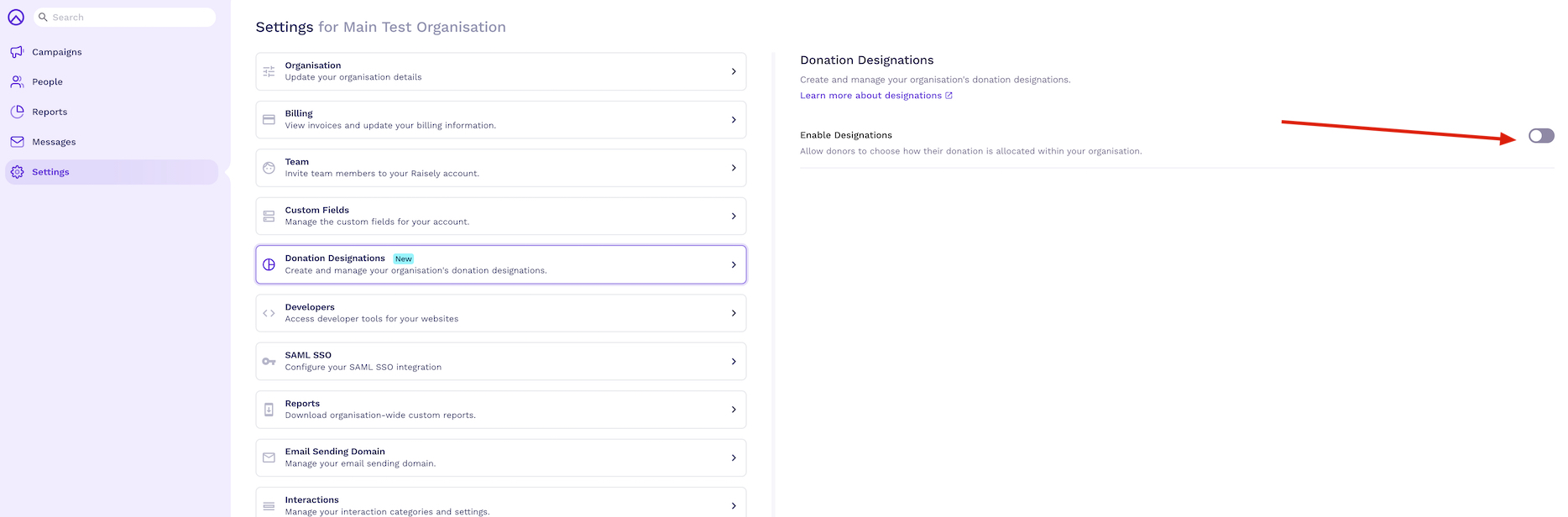 To turn on designations, go to Organisation Settings → Donation Designations and toggle Enable Designations on.